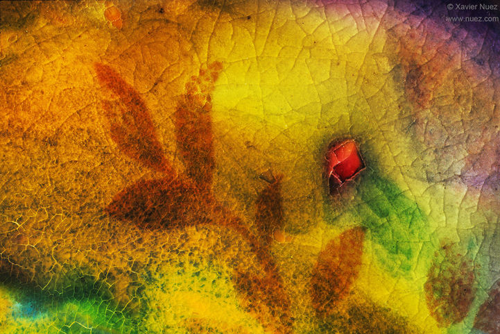 I select plates that already have designs on them (usually floral). I then apply a crackle glaze and vibrant, colored paints, which give them extraordinary textures and colors. They are less than an inch across and are extremely fragile due to my unusual process.